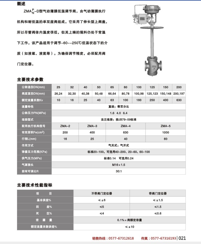 ZMAP/N-D氣動(dòng)薄膜低溫調(diào)節(jié)閥,由氣動(dòng)薄膜執(zhí)行機(jī)構(gòu)和耐低溫的單雙座閥組成。它采用了伸長型上閥蓋,所以盡管閥體內(nèi)溫度低,但其上端的填料仍處于常溫下工作,該產(chǎn)品適用調(diào)節(jié)-60- -250℃低溫狀態(tài)下的介質(zhì)(如液氧、液氮)。為確保調(diào)節(jié)精度,必須配用閥門定位器。詳情:http://www.hpbtpnh.cn